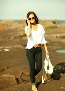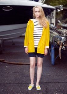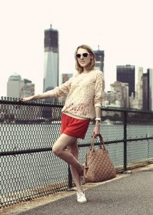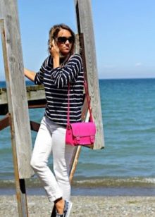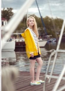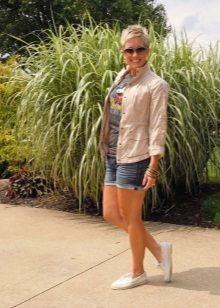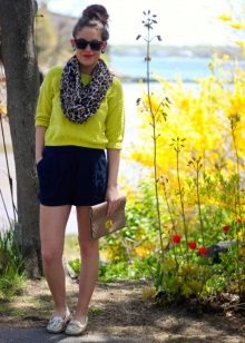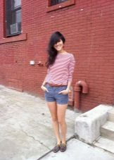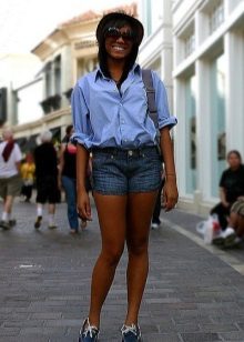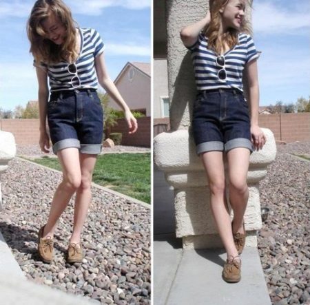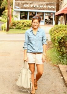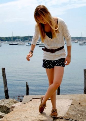 สำหรับการเดินแม้ว่ามันจะไม่ใช่ทะเลคุณสามารถใส่กางเกงขาสั้นข้างบนได้อย่างปลอดภัย รองเท้าสีน้ำเงินสดใสด้วยการปักสีขาวลักษณะสง่าและฤดูร้อน ขอบเขตสีฟ้าของภาพถูกเน้นและเติมเต็มด้วยอุปกรณ์เสริมสีน้ำตาล