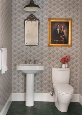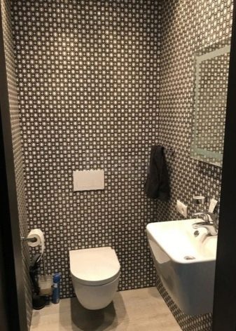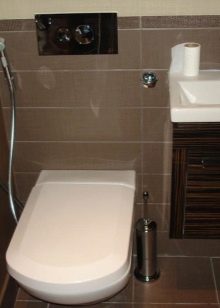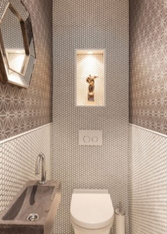 อ่างล้างจานขนาดเล็กเก๋ไก๋ ทำจากหินเทียมหรือหินธรรมชาติ มันจะดูดีเมื่อเทียบกับพื้นหลังของผนังที่ตกแต่งด้วยวัสดุที่มีรูปแบบดั้งเดิมและพิมพ์ในสีน้ำตาลสีเบจและสีขาว ห้องน้ำสามารถติดตั้งในตัวพร้อมกับถังที่ซ่อนอยู่ในผนัง