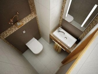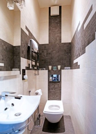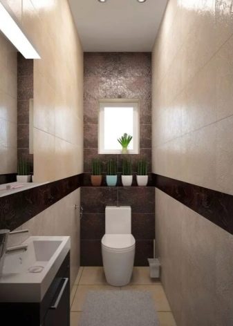 ห้องน้ำที่แคบและยาวสามารถใช้กระเบื้องสีเบจที่มีลายช็อคโกแลตวิ่งไปตามผนัง ผนังด้านหลังห้องน้ำควรตกแต่งด้วยวัสดุสีเข้ม เทียบกับพื้นหลังของกำแพงสีน้ำตาลมันคุ้มค่าที่จะติดตั้งห้องน้ำสีขาวแบบคลาสสิกและอีกเล็กน้อยจากนั้นไปตามผนังเพื่อแก้ไขอ่างล้างจานขนาดเล็กที่มีชามสีขาวและโต๊ะข้างเตียงแคบสีน้ำตาล การตกแต่งภายในจะกลายเป็นมีสไตล์ที่อุดมไปด้วย