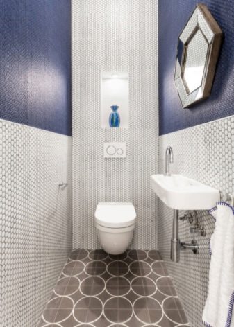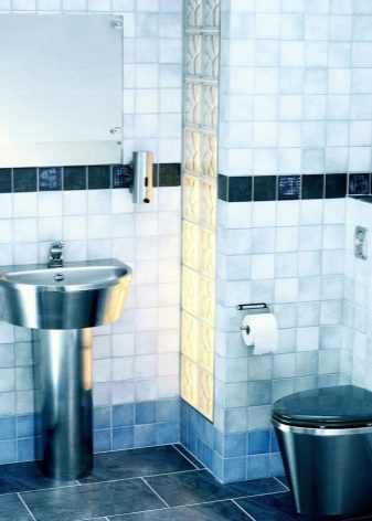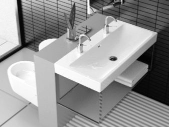 อ่างล้างจานขนาดยาวแบบแขวนจะดูกลมกลืนกับห้องน้ำจี้ที่มีถังน้ำที่ซ่อนอยู่ในผนัง รายการที่คล้ายกันของการประปาจะกลายเป็นคุณสมบัติที่น่าสนใจของห้องที่มีผนังตกแต่งด้วยกระเบื้องสีขาวและสีน้ำเงินเข้ม เลย์เอาต์โมเสกบนผนังจะดูดี กระจกที่มีกรอบสีน้ำเงินเข้มกว้างควรแขวนเหนืออ่างล้างจาน