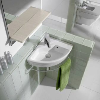 ที่เล็กที่สุดคือ มุมอ่างล้างมือขนาดเล็ก. พวกเขาใช้พื้นที่ว่างเล็ก ๆ น้อย ๆ ในห้องน้ำ ตัวเลือกของรูปร่างที่ไม่ได้มาตรฐานนั้นดูดีเช่นทรงกลมหรือวงรี เลือกการดัดแปลงเฉพาะตามเค้าโครงและพื้นที่สี่เหลี่ยมจัตุรัสของห้อง