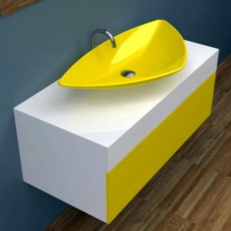 รูปแบบมุมได้รับการแก้ไขโดยติดกับผนังสองด้านในห้องน้ำดังนั้นความกว้างของพวกเขาสามารถมากกว่า - 35-40 ซม. น้ำหนักของผลิตภัณฑ์เหล่านี้ยังสามารถมากขึ้น หากมีตู้“ ทิวลิป” หรือส่วนรองรับอื่น ๆ ใต้อ่างล้างมือคุณก็ไม่ต้องกังวลกับน้ำหนักของโครงสร้าง