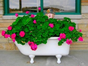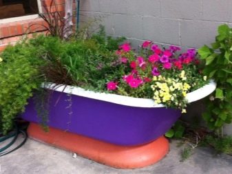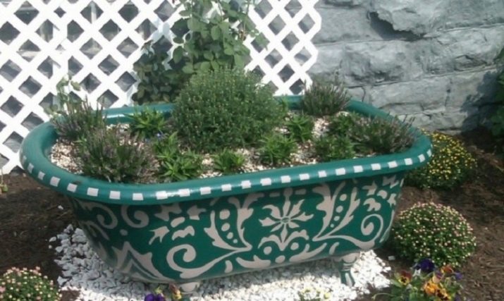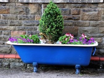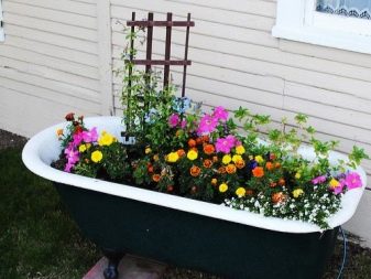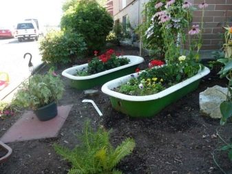 เตียงดอกไม้ที่ยอดเยี่ยมสามารถทำจากอุปกรณ์ซักผ้าที่ล้าสมัยยิ่งไปกว่านั้นเตียงนี้ติดตั้งด้วยการระบายน้ำในรูปแบบของหลุมท่อระบายน้ำ เพื่อปรับปรุงรูปลักษณ์ของมันคุณสามารถใช้: