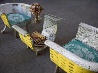 - เตียงอาบแดดพิเศษจากการอาบน้ำ ทำแบบเดียวกันกับโซฟาโต๊ะและเก้าอี้ แต่ในเวลาเดียวกันผลิตภัณฑ์ทั้ง 3 ด้านก็ถูกตัดออกไป มันสามารถตกแต่งด้วยกระเบื้องโมเสคและกระเบื้องทาสีด้วยสีอะครีลิควางที่นอนและหมอนบนหัวเตียงจากด้านบน