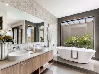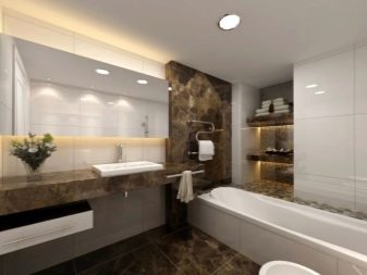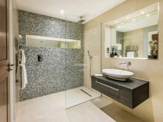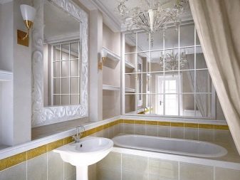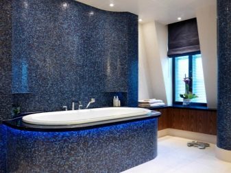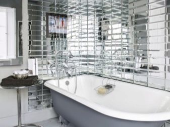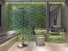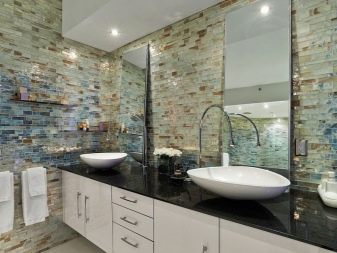 ทางออกที่สร้างสรรค์สำหรับการตกแต่งผนังห้องน้ำสามารถเป็นกระเบื้องกระจก. ไม่เหมือนปกติมันไม่แข็งแรงมันต้องติดตั้งในพื้นที่แห้งของห้องน้ำกว้างขวาง เช่นเดียวกับกระจกโมเสกมันสามารถกลายเป็นองค์ประกอบการออกแบบที่เป็นอิสระ วัสดุตกแต่งรุ่นนี้ดูมีเอกลักษณ์ไม่ซ้ำใครเหมาะสำหรับตกแต่งภายในห้องน้ำในสไตล์ทันสมัย