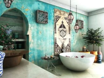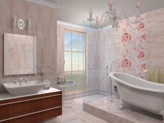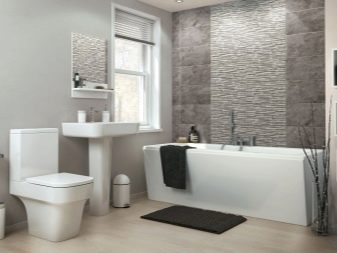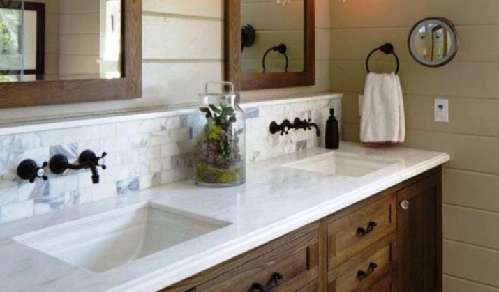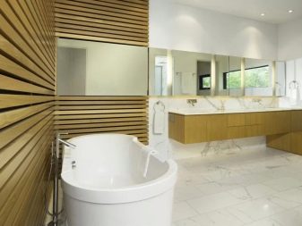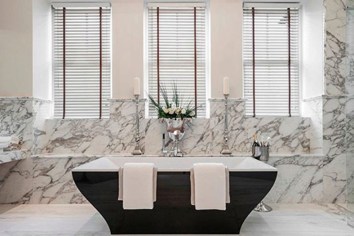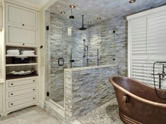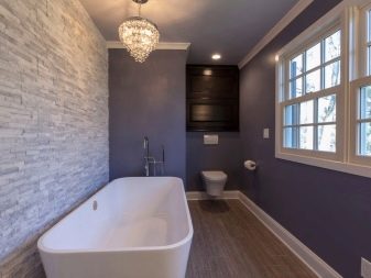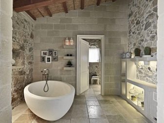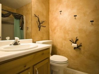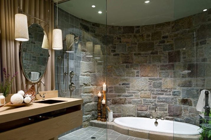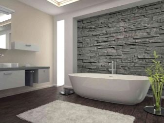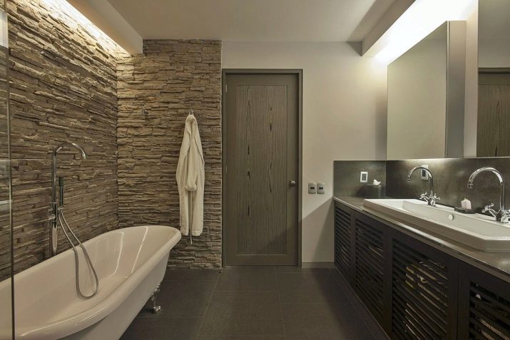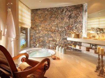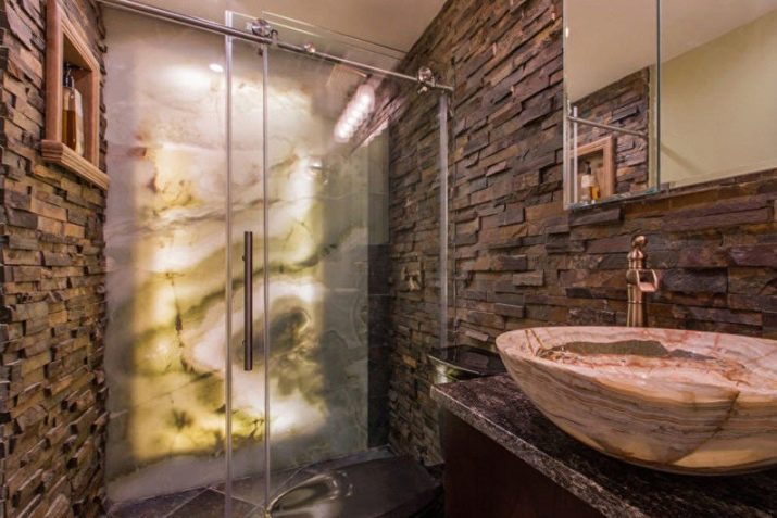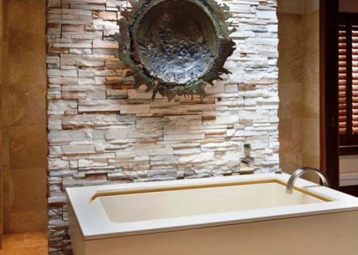 แตกต่างจากวัสดุตกแต่งบางอย่างมันสามารถใช้ในพื้นที่เปียกของห้องน้ำ เสร็จนี้ช่วยให้คุณสร้างการตกแต่งภายในในฝันให้สถานะสูง ในขณะเดียวกันมันก็ต้องการการรวมเข้ากับวัสดุอื่น ๆ ความอุดมสมบูรณ์ของหินในการตกแต่งภายในห้องน้ำดูน่าเบื่อและแข็ง