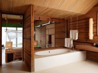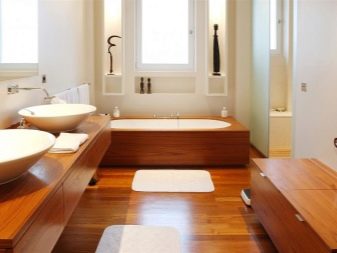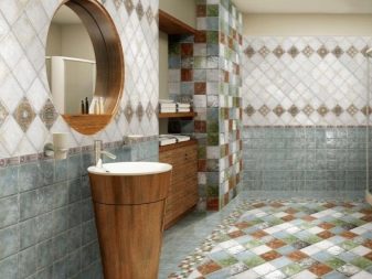 - ตัวอย่างของความแตกต่างของไม้และพื้นผิวเซรามิก, การจัดเรียงของห้องน้ำในบ้านในชนบท
