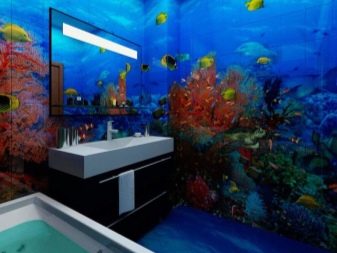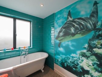 การปรากฏตัวของภาพพิมพ์ขนาดใหญ่บนผนังที่ไม่จำเป็นต้องออกจากห้องเพื่อเน้นพื้นที่ ความแตกต่างหลากหลายนำความเบื่อหน่ายและแบ่งสไตล์ของการตกแต่งภายใน ปลาโลมาขนาดใหญ่ตัวเดียวกันบนพื้นหลังของปลาการ์ตูนก้นทะเลหรือปลาตลกจะถูกแช่อยู่ในบรรยากาศที่แปลก การตกแต่งภายในใด ๆ จึงดูงดงามและมีความหมายเนื่องจากการออกแบบพื้นหลังถูกถอดออกเพื่อให้สามารถมองเห็นท่อประปาเฟอร์นิเจอร์และอุปกรณ์เสริมกับพื้นหลังได้