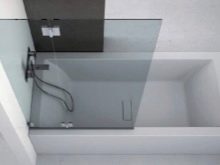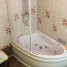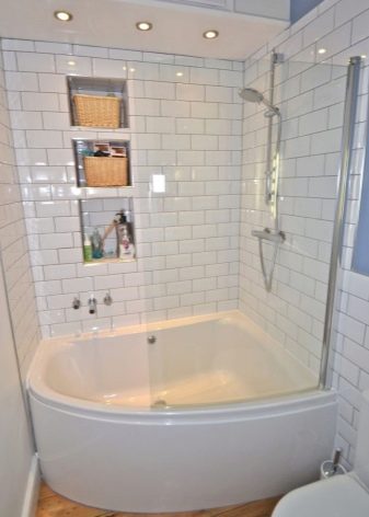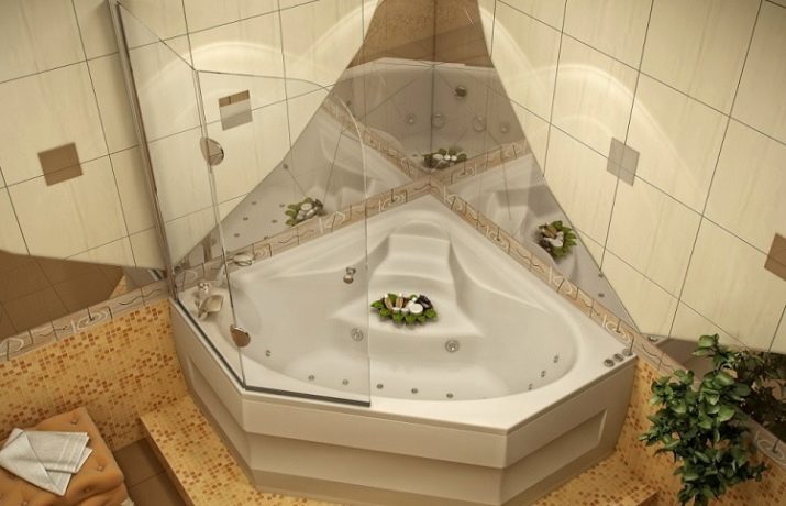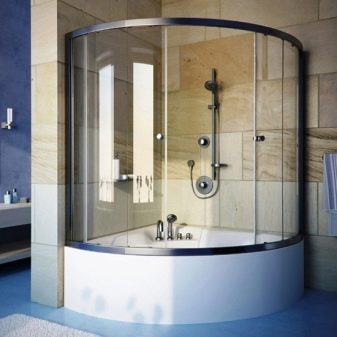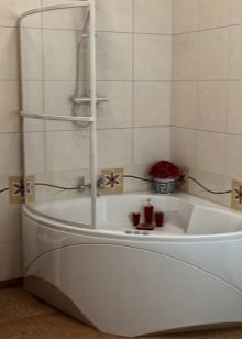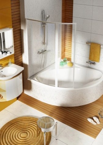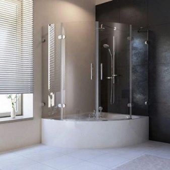 สิ่งกีดขวางของรูปร่างนี้มักใช้ในอ่างอาบน้ำมุมพร้อมฝักบัวและอุปกรณ์นวดด้วยพลังน้ำ ฉากกั้นห้องเหมาะสำหรับห้องน้ำขนาดเล็ก วิธีการแก้ปัญหาที่คล้ายกันดูต้นฉบับและทันสมัย มุมสามารถทำในรูปแบบของตัวอักษร“ G” หรือ“ P” บางครั้งก็มีโครงสร้างกระจกเรเดียลแม้ว่าการผลิตของพวกเขาจะซับซ้อนกว่าและแพงกว่ามาก