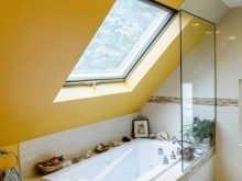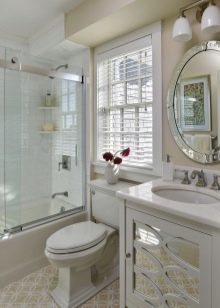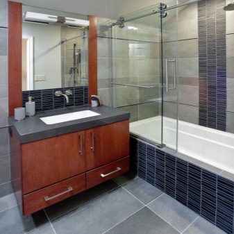 แบบฟอร์มนี้ช่วยให้คุณสามารถนำแนวคิดการออกแบบดั้งเดิมมาใช้อย่างประสบความสำเร็จ มันเข้ากันได้กับโบลิ่งมิติตั้งอยู่ในอ่างปริมาตร พาร์ติชันสี่เหลี่ยมคางหมูมักจะสมบูรณ์โดยประตูสวิงหรือลูกตุ้ม โครงสร้างทั้งหมดรวมถึงแบบเส้นตรงคงที่อยู่กับที่ อุปกรณ์ยังเหมือนกันอย่างสมบูรณ์
