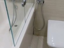 ม่านกระจกสำหรับห้องน้ำไม่เพียงแค่ดูน่าดึงดูด มันหลีกเลี่ยงการสาดลงบนพื้น กระเบื้องที่เปียกชื้นลื่นมากและตกลงมาได้ง่าย การกระเด็นของน้ำบนผนังนั้นไม่อันตรายเลย แต่แทบจะไม่มีใครชอบลายทางหยดน้ำ
