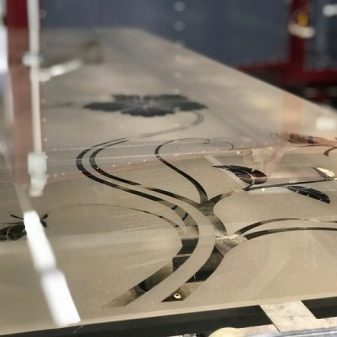 บ่อยครั้งที่ผู้คนซื้อพาร์ติชั่นกระจกพร้อมภาพที่พิมพ์โดยการพิมพ์ภาพถ่าย สาระสำคัญนั้นง่ายมาก: มีการใช้สารพิเศษซึ่งทำให้เกิดการรวมตัวภายใต้การกระทำของรังสีอัลตราไวโอเลต การพิมพ์ภาพถ่ายสามารถสร้างภาพได้เกือบทุกรูปแบบและสี ตัวเลือกเคลือบ (หรือค่อนข้างเป็นด้าน) ซึ่งได้จากการเป่าด้วยทรายก็เป็นที่นิยมเช่นกัน ส่วนใหญ่แล้วใช้ stencils ของ Oracal ในกระบวนการผลิต