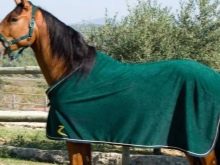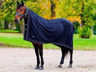 - แผงขายเสื้อผ้า ออกแบบมาเพื่อปรับอุณหภูมิร่างกายของสัตว์ให้เป็นปกติหลังจากเดินฝึกซ้อมหรือทำงานในที่ที่มีอากาศบริสุทธิ์ หากต้องการเย็บให้ใช้ผ้าฝ้ายวาฟเฟิลหรือผ้าขนสัตว์ที่ดีที่สุด เสื้อคลุมสวมใส่บนม้าทันทีที่มาถึงที่คอกม้าและยังคงอยู่จนกว่าร่างกายจะแห้งสนิท ขนาดของผ้าห่มอบแห้งควรมีขนาดใหญ่และไม่ จำกัด ความกว้างของการเคลื่อนไหวของม้า แหลมที่แนบมากับร่างกายของสัตว์โดยใช้เข็มขัดที่อยู่ด้านใน