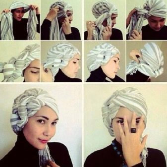 Türbanı bağlamanın birçok yolu vardır: Müslüman, bir koşum takımı, Afrikalı ve diğerleri. Hepsi teknoloji, karmaşıklık, son görünüm açısından birbirinden farklıdır.