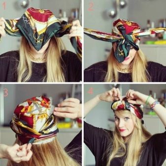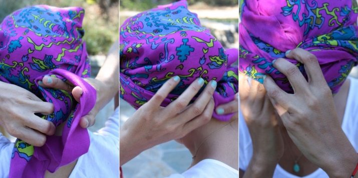 Saçınızı çıkarmak istiyorsanız, kalan üçüncü köşeyi kullanmanız gerekir. Başın üstü açık bırakılabilir ve saçları dışarı çıkarabilir. Bu seçeneklerden herhangi biri güzel ve sıradışı görünecek.