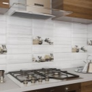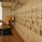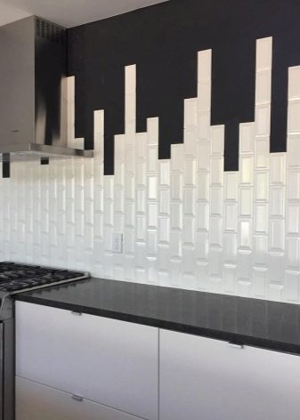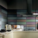 - Dikey duvarcılık vardiyalı bir klasik prensibi ile gerçekleştirilebilir. Ayrıca, elemanların şekli hem kare hem de dikdörtgen olarak kullanılabilir. Böyle bir apronun görünümü, tek renkli bir karo kullanılarak istenen etki için standart değildir.