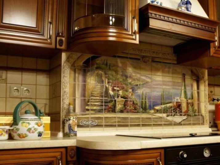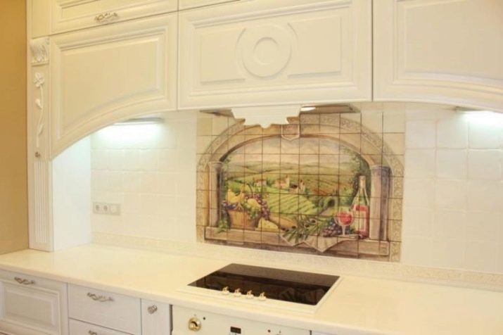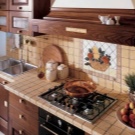 Doğru yaklaşımla, önlüğü mozaik karolarla süsleyebilirsiniz. Bununla birlikte, dozlanması gerekeceği akılda tutulmalıdır: burada sadece bir panel ile ilgilidir. Ana arka plan, buzlu, muhtemelen dışbükey bir dokuya sahip düz monokromatik yapılmalıdır. Aynı zamanda, tonlar mutfak iç mekanının renk şeması ile birleştirilecek şekilde seçilmelidir. Geleneksel ülkenin renkleri daha sıcaktır, fayans seçmek için kuralların geri kalanı aynıdır.