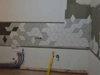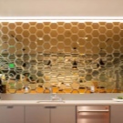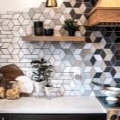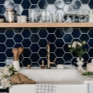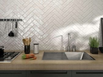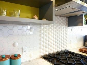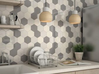 - petek altıgen fayans döşenirken elde edilir. Bu durumda, ideal geometriyi gözlemlemek son derece önemlidir, çünkü dikişin 1 mm uyumsuzluğu bile bitmiş astarın görünümünü bozacaktır. Bugün, bu kurulum modern mutfakların önlüklerini astarlamak için en uygun olanlardan biri olarak kabul edilmektedir.