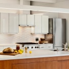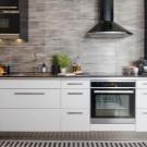 - Nötr bir mutfağın iç kısmındaki uyumlu fayans seçimine bir örnek.