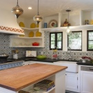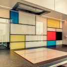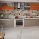 - Mutfak ünitesinin beyaz rengi ile birlikte parlak renklerde çok renkli fayansların kullanımı.