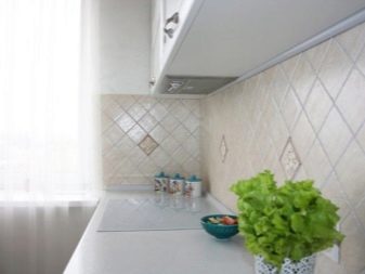 - diyagonal mutfağın içine taze bir görünüm getirmenizi sağlar, ilginç görünüyor, 45 derecelik bir açıyla kare plakaların döşenmesidir. Aynı şemaya göre, kaydırmalı tuğlalarla astarlama yapılır. Yöntem zaman alıcı olarak kabul edilir, ayrıca böyle bir kaplama ile daha fazla malzeme gereklidir ve daha fazla trim gerekir.