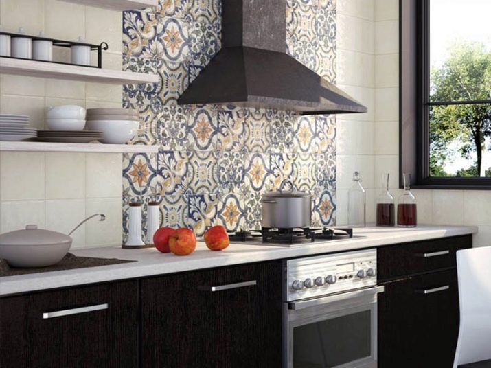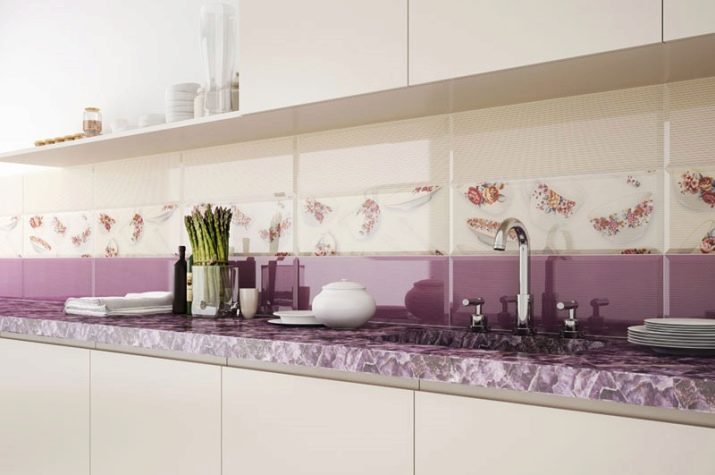 Döşeme yaparken, farklı boyut ve şekillerde plakaları birleştirerek kaplama seçeneğini seçerek hayal gücünü gösterebilirsiniz. Örneğin, apronun ana kısmı normal şekilde ve merkezi kısmı - zıt renkte mozaik elemanların eklenmesi ile ortaya konabilir. Bir paneli bir apronun üzerine kenarlık veya mozaikle çerçevelemek mümkündür. Birisi, zıt karo parçalarının kullanımına odaklanarak stili yener.
