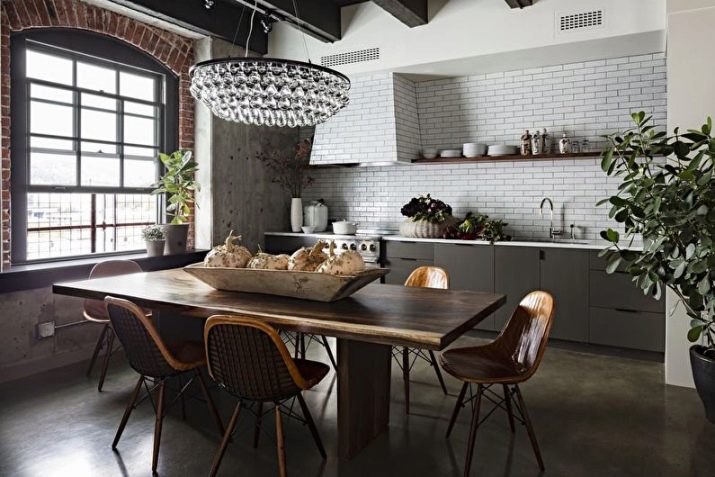 Çatı katı tarzı bir mutfağın dekorasyonu için fayanslar seçildiğinde, durum farklıdır. Burada karmaşık bir şey almak istenmeyen bir durum, çünkü endüstriyel bir tesis atmosferi yaratmak önemlidir. Bunu göz önünde bulundurarak, karo mümkün olduğunca basit olmalıdır. Örneğin, parlak bir ön yüzeye sahip beyaz rengin sıradan kare detayları şeklinde bir seçenek olabilir.