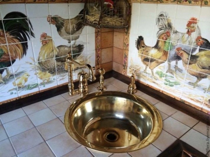 Baskı motifleri stile uygun olmalıdır: bunlar çayır çiçekleri, horozlar, tavuklar, sülünler, eski natürmortlar, muhtemelen ayçiçeği, peygamberçiçekleridir. Panel, basit bir çiçek deseniyle dekore edilmiş ince bir sınırdan bir çerçeveye çerçevelenebilir. Bu durumda, karo, renklerin ve spesifik kompozisyonların seçildiği bir seri çift ile eşleştirilir. Boyutu küçük olmalı, şekilleri genellikle kare.