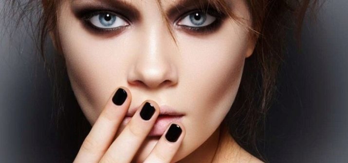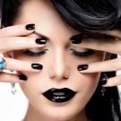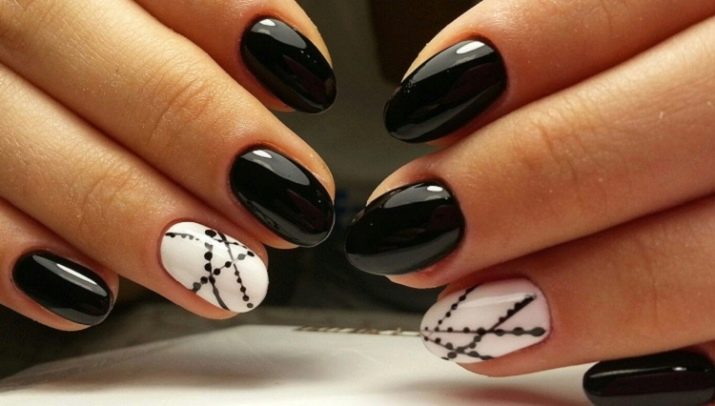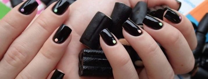 Siyah renk oldukça parlak. Hemen sadece tırnakların uzunluğunu vurgulamaz, aynı zamanda şekillerini de keskin bir şekilde gösterir. Burada, özel tırnak şeklinizin yanlış seçimi ile ilişkili olan kötü tasarımın ana dezavantajı ele alınabilir. Plakanın yan duvarlarına ve deliğe bağlıdır. Siyah renk formun kusurlarını arttırmaz, formun kusurlarını yenmek, görsel ağırlığı kaldırmak ve denge yanılsaması yaratmak zorunda kalacaksınız.
