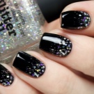 Sürtünme vurgulu tırnakların arka planı olabilir. Siyah vernik sayesinde farklı bir etki ve zarafet derecesi elde edebilir. Örneğin, altın, gümüş, ayna, metal, kumaş veya hatta deri olabilir. Üzerinde böyle bir arka plan veya tutkal akrilik tozuna karşı siyah jel ile boyarsanız, tasarım benzersiz hale gelecektir. Damgalama gelince, siyah bir arka planda minimum olmalıdır. Bu durumda, gradyan tekniğinde damgalı bir baskı yapılmasına izin verilir.