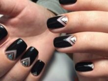 Geometrik bir tasarımı temel alabilirsiniz. Bugün moda ve buradaki siyah renk temel ve desen olarak seçilebilir. Örneğin, geometrik şekiller fikrini kullanabilir, vurgu tırnaklarına farklı boyutlarda noktalarla düz çizgiler çizebilirsiniz. Buna ek olarak, içi boş geometrik şekiller ve her türlü üçgen modada.