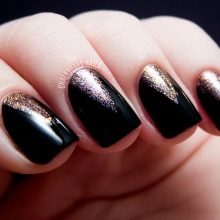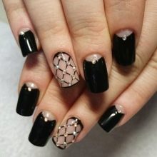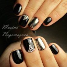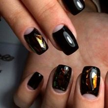 Siyah klasik manikür tasarımını kırık cam tekniği ile dekore edebilirsiniz. Küçük parçalara kesilen ve daha sonra sıvı bir tepeye yapıştırılan ince bir filmin taşması nedeniyle, manikür çok parlak ve etkileyici görünecektir. Buna ek olarak, çok ilginç görünen geleneksel ve tersine çevrilmiş servis ceketi birleştirebilirsiniz. Klasiklerin ve ay tasarımının düeti, siyahta eşit derecede etkileyici olabilir.
