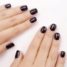 Şık bir form tercih etmeniz gerekiyor gibi görünse bile, kısa tırnaklarda bu her zaman mümkün değildir. İdeal olarak, tırnak plakalarının yan duvarlarının birbirine paralel olması durumunda endişelenemezsiniz. Bu durumda, tırnaklardaki jel cilasının siyah rengi hem düz bir çizgiyle hem de keskin bir testere çizgisiyle güzel görünecektir.