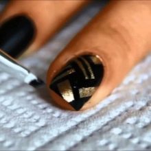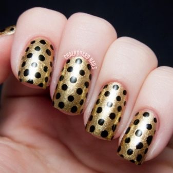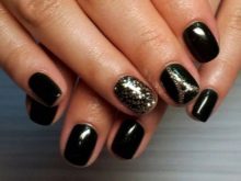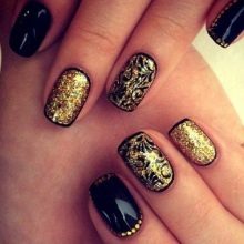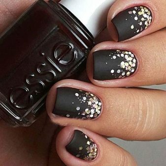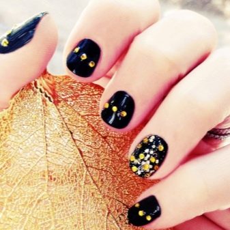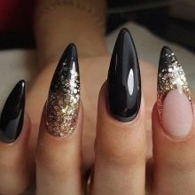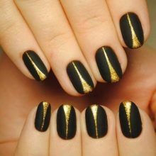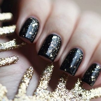 Siyah, altın parıltılarla birlikte çok zarif görünecek. Aynı zamanda, sadece bir veya iki vurgu parmağının altınla vurgulanması gerekir. Bu durumda, altın parlaklığın altındaki taban hem renksiz hem de siyah olabilir. Daha büyük bir kontrast etkisi için, hafif bir taban seçmek ve tüm çiviyi iki kat halinde altın pullarla kaplamak daha iyidir.