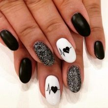 İyi ve doğru bir çözüm, paletin iki ana renginin siyah ve beyazın klasik kombinasyonudur. Vurgu tırnaklarında beyaz tırnak deliklerini vurgularsanız, yaratıcı ve zıt bir tasarım elde edersiniz. Ve birkaç rhinestones ekleyerek, hemen ilginç ve ciddi bir manikür yaratacaksınız. Siyah ve beyaz bir manikür ile parıltı ve rhinestones ile aşırıya kaçmayın - kesinlikle ihtiyacımız olmayan özensiz bir etki elde edebilirsiniz.