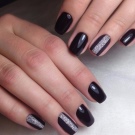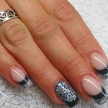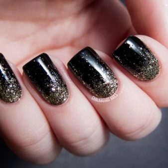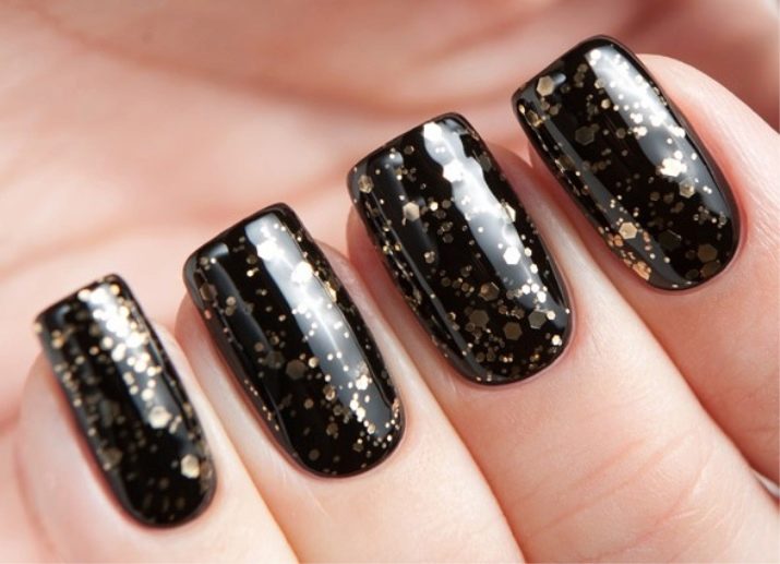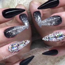 Dekoratif bir unsur olarak, rhinestones ve pırıltılar alabilirsiniz. Çiviye ilk kez şeffaf bir taban uygulayan, ancak kuruduktan sonra siyah bir gölge uygulamaya başlayabilirsiniz.
