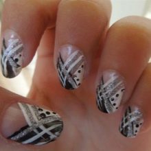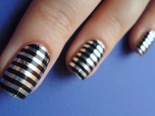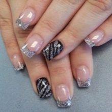 Tırnaklardaki bir şerit her zaman değerlidir; bugün modası geçmemiştir. Arka planın karanlık olması gerekmez, zebra veya leopar rengi şeklinde gümüş bir renk tonu uygulanabilir. Genel olarak, son zamanlarda bir hayvan rengine benzeyen manikürlü podyum modellerinde giderek daha fazla ortaya çıkıyor.
