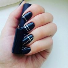 Yapılan tüm çizgiler düz olmalıdır, çünkü ihmal için yer yoktur. Siyah kaplama ana kaplama olarak seçilirse, kütiküle ulaşmalıdır. Manikür yapmadan önce, ellerini kesinlikle sıraya koymalısın. Bunu yapmak için uzunluk ve şekil kesilir, kütikül çıkarılır.