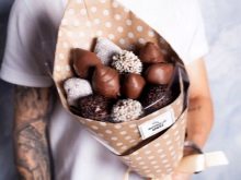 - çikolata. Bir kutu çikolata getirebilir veya tatlı bir kart seçebilirsiniz. Bu küçük jeton ucuzdur. Harika bir seçenek, iki hediyenin aynı anda birleştirileceği bir çikolata buketi olacaktır.