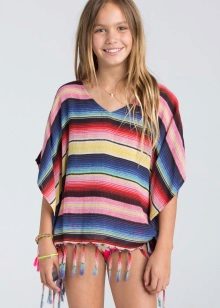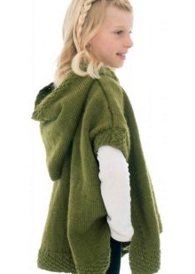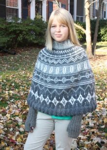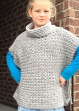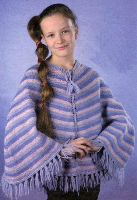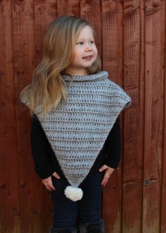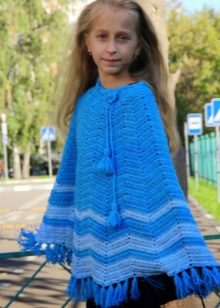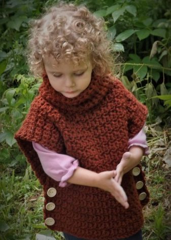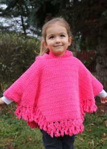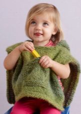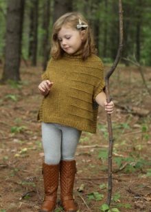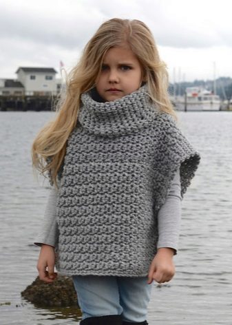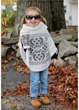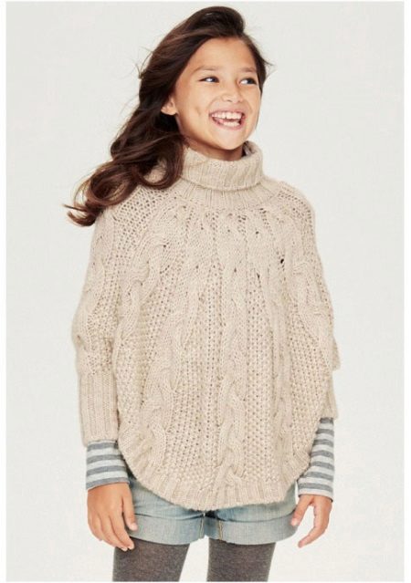 Bir kız için bir panço herhangi bir uzunlukta olabilir, ancak en iyi seçenek üst uylukları örtmektir. Stiller de çeşitliliğinden memnun. Klasik pançoların ana özelliği kollu eksikliğidir. Buna göre, panço-kolsuz ceket veya düğmeli veya fermuarlı bir yelek gibi bir çocuk şey popülerdir.