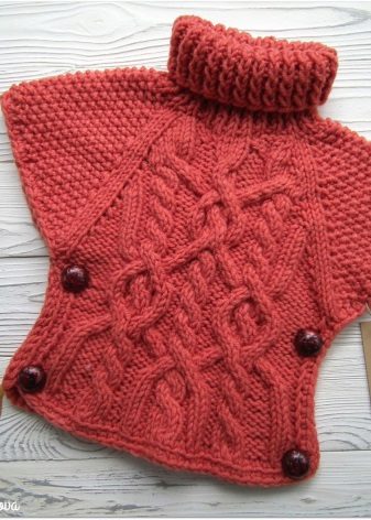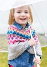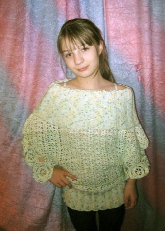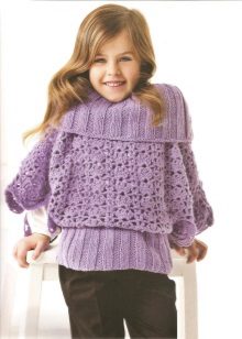 Çocuk modeli kazak veya kazak şeklinde yapılacak (reglan boynu ve kural olarak çok güzel bir boyunduruk ile). Böyle bir şey, geleneksel kazak modelleri kadar ısınmaz ve serbest form, kızın cildinin serbestçe nefes almasını sağlar.