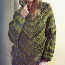 Bir genç kız için seçenek. Narin lavanta-pembe-lila tonlarının melanj ipliklerinden yapılmış örme panço ceket, kırılgan bir figür üzerinde yumuşak kıvrımlarla hafifçe akar. Uçan bir siluet, şimdi alakalı saçak ve bağları bir bağlantı elemanı görüntüyü kadınsı ve şık hale getirir.