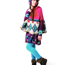 Bir demi sezon giyim olarak yararlı bir kız kız öğrenci için bir başlık ile parlak panço. Pembe ponponlar şeklinde neşeli bir saçaklı üçgen bir şekil ve elbette, özellikle siyah bir arka plan üzerinde etkileyici görünen farklı boyutlarda çok renkli daireler şeklinde bir baskı, şeylerin özgünlüğünü verir. Koyu saçlı esmer kızların yüzüne benzer bir renklendirme. Pembe kadife pantolonlar bir saçak ve dış giyim baskısı ile rengi yansıtıyor, siyah rugan ayakkabılar da yer alıyor.