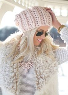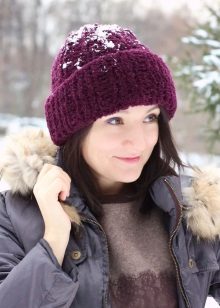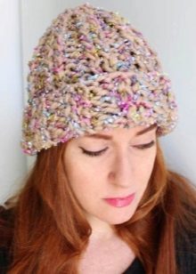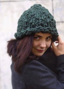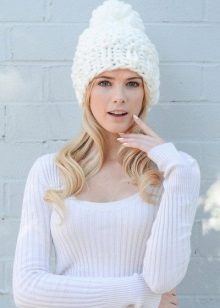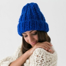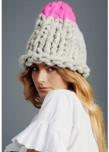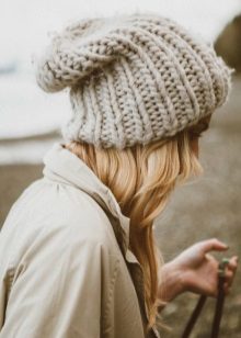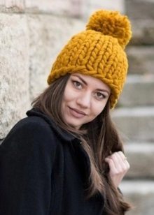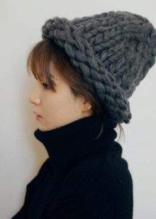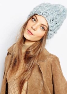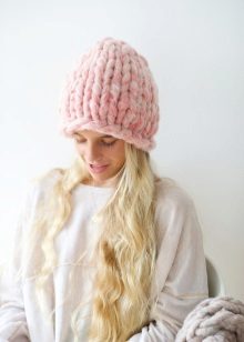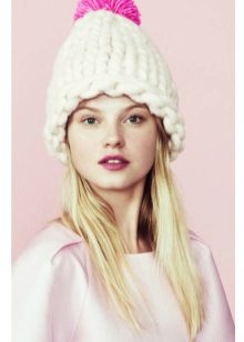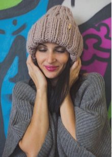 Kalın iplikten yapılmış bir şapka çok şık görünüyor. Kalın bir örme ürünün dokusu biraz pürüzlü hale gelir, bu nedenle böyle bir şapka herhangi bir kızın kırılganlığını ve sofistike olduğunu mükemmel bir şekilde vurgular.