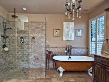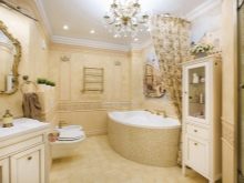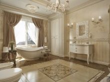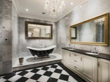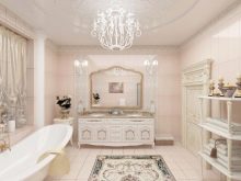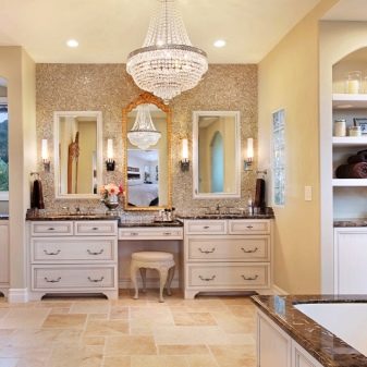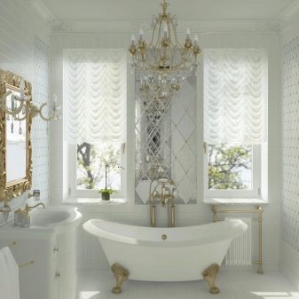 - Klasik. Banyo tasarımındaki klasik tarz lüks ve hatta aşırı ponpon anlamına gelir. Burada, sadece orijinal sıva kalıpları ve bronz veya bakır tonları olan pahalı lamba versiyonları uygun olacaktır. Bu durumda ideal seçenek, süslü renkler şeklinde metal çerçeveler olacaktır. Ayrıca, pahalı porselen veya seramik avizeler burada iyi görünebilir. Kristal lambalar kendilerini en iyi şekilde gösterirler.