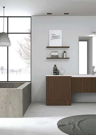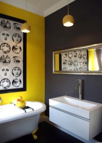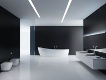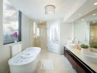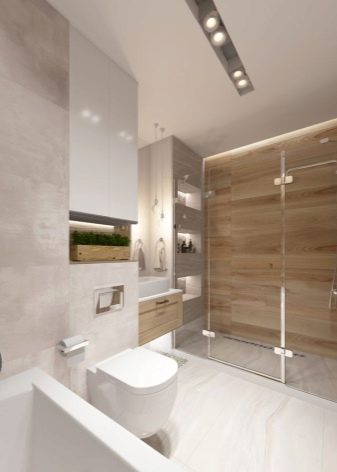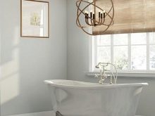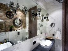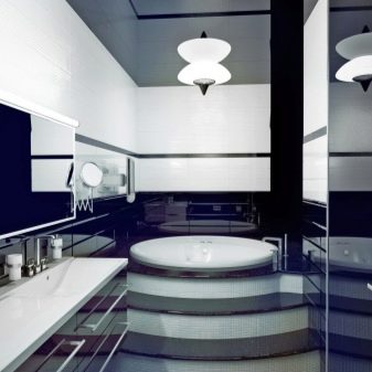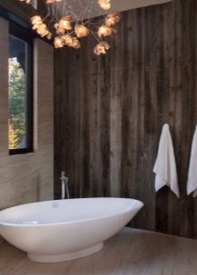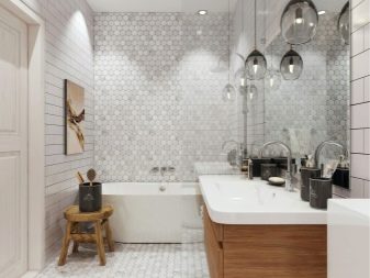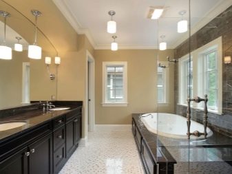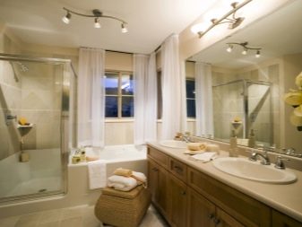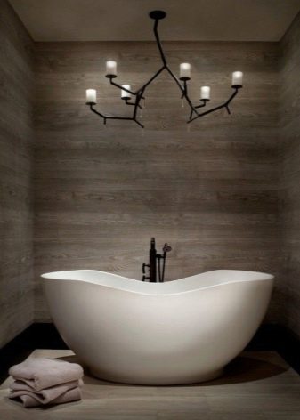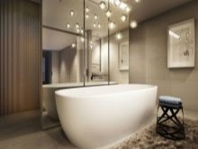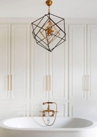 - minimalizm bugün banyo tasarımında modaya uygun olarak kabul edilir - burada avizeler, iç mekanı tamamlamaktan ziyade aydınlatma işlevini yerine getirir.