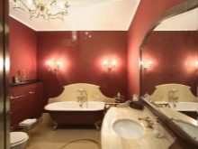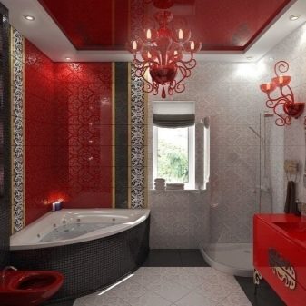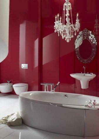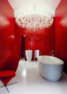 - Kırmızı. Bu, sadece belirli bir stile bakmak için uygun olacak olan banyo için en belirsiz renktir. Ayrıca, koyu veya pastel tonlarını kullanırken renk başarılı olabilir. Diğer versiyonlarda, kırmızı renk kaygı, ajitasyon ve saldırganlığı kışkırtır.