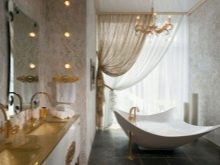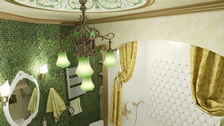 - modern. Banyoda bu tarzın ana özelliği, iç kısımdaki çiçek ve bitki bileşenlerinin varlığıdır. Burada, süslü çiçekler veya dallar şeklinde yapılan plafondlar ve çerçeveler başarıyla görünecek. Bu tür bileşimler için, metal çerçeve, cam veya vitray gölgeli armatürler en uygunudur.