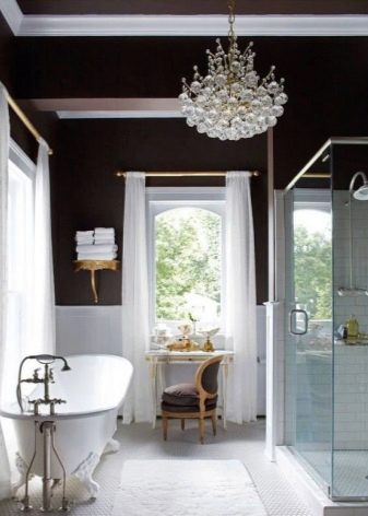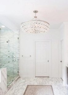 - Kristal desenleri. Kristal avizeler, klasik veya modern bir tarzda banyo tasarımında klasik bir seçenek olarak kabul edilir. Kristal avizelerin en önemli artısı, bu modellerin şaşırtıcı güzelliği ve zengin görünümüdür. Bunların aksine iki büyük dezavantaj var - sizi güçlü montaj braketleri kurmaya zorlayan küçük kristal modellerin bile ağırlığı ve doğal kristal avizelerin yüksek maliyeti ve lekesi.