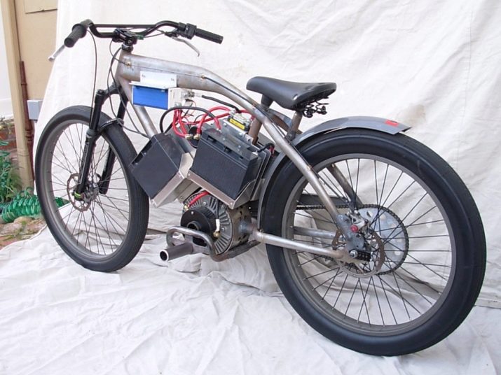 Çerçeveyi özel bir şekilde güçlendirmeden, birkaç kilowatt'a kadar güce sahip bir motoru kullanmanız mümkün değildir. 40 km / s'den daha yüksek bir hız zaten iyi bir amortisman gerektirir - onsuz, yol boyunca küçük bir çarpma veya çatlakla karşılaşırsanız eyerden atılırsınız. Fiş bir motosikletten veya yokuş aşağı bir bisikletten (ikincisi etkileyici bir kütleye ve en yüksek mukavemete sahiptir, diğer tür ve çeşitlerdeki bisikletler için ulaşılamaz). Buradaki pil takımı da 20 kg ağırlığında.